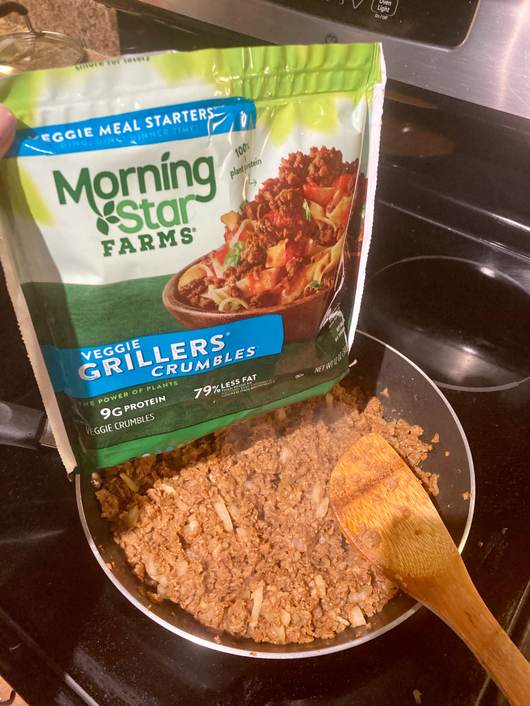- Heat two tablespoons of extra virgin olive oil in sauce pan. Sauté crumbles until cooked through. Add onion and sauté until onion becomes translucent. Mince garlic or use garlic press to extra garlic into pan. Stir to combine.